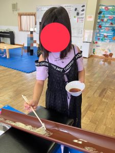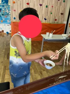 流れてくるそうめんをすくって、自分たちで作った具材をトッピング🌟