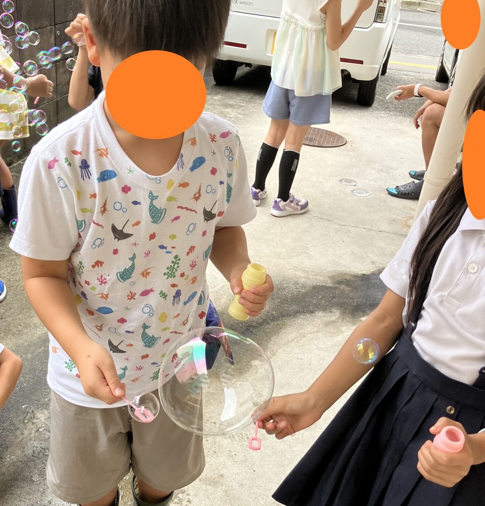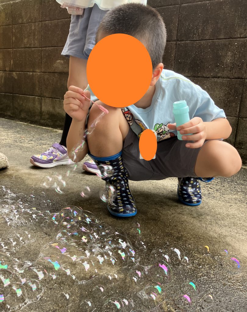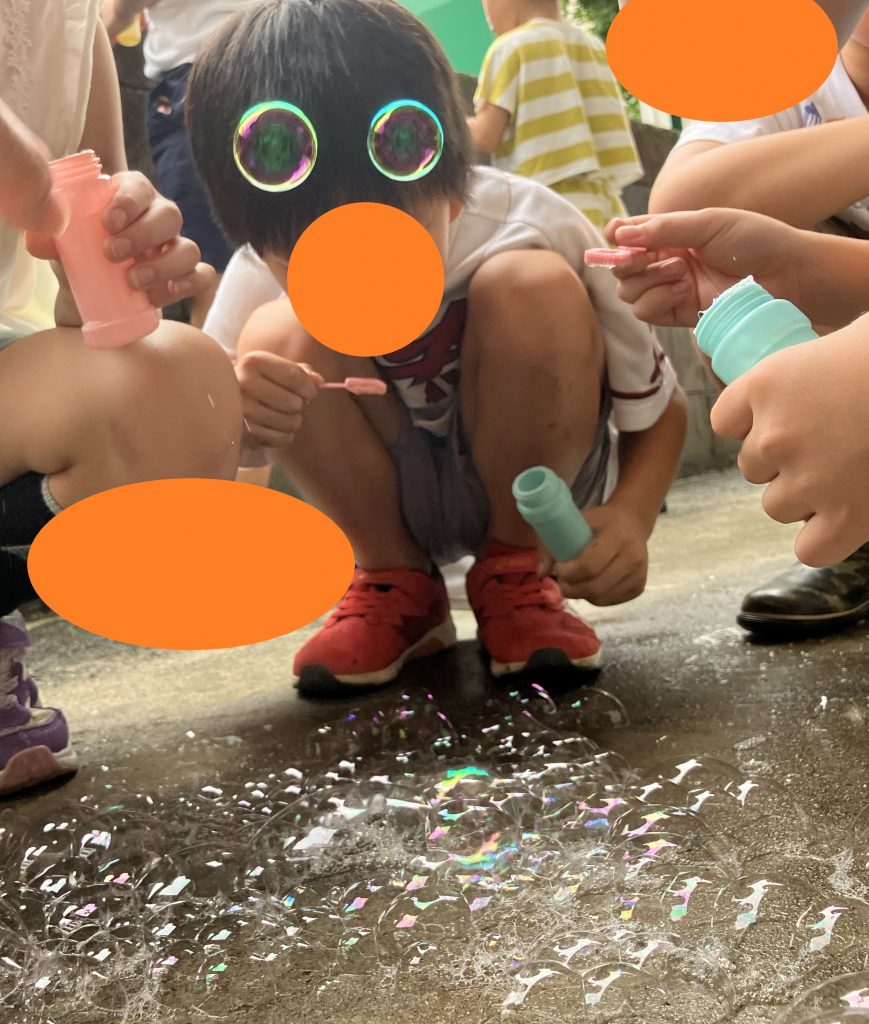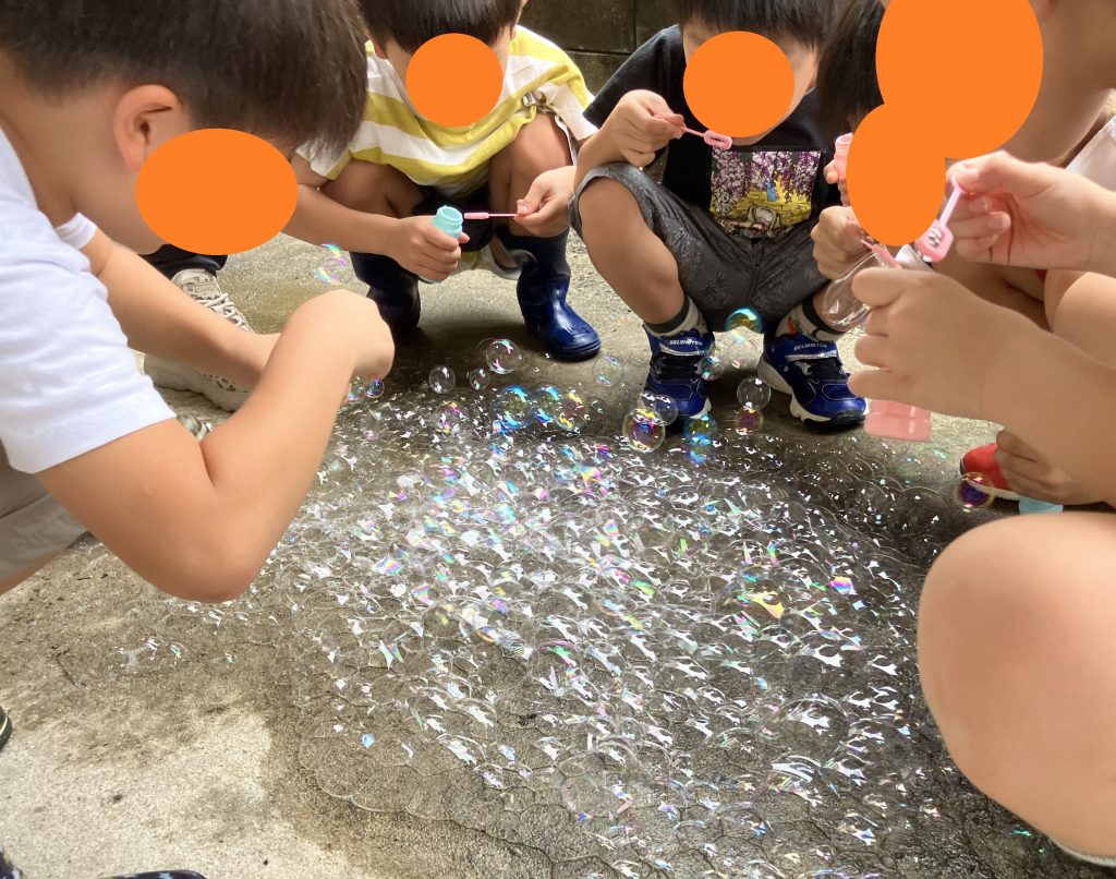 大きなシャボン玉を作ってそれを割らないように吹き具でそっとキャッチする遊び方や、湿った地面にシャボン玉をみんなで吹きかけて重ね、大きな島を作る遊び方など、それぞれの楽しみ方を見つけることが出来ました!