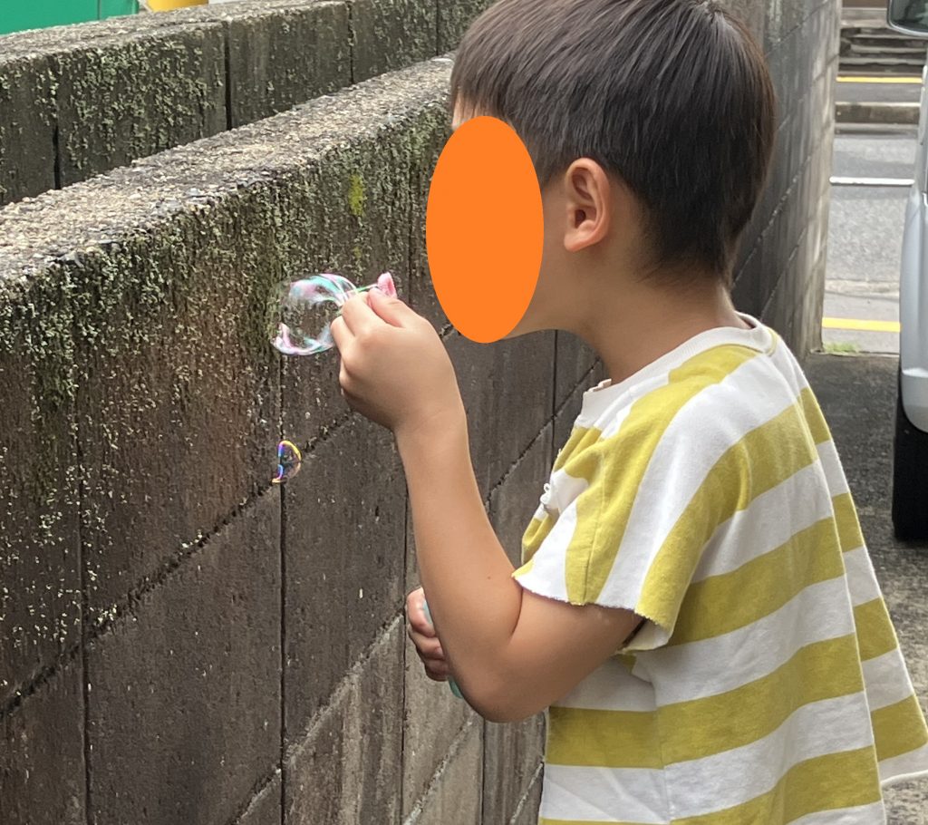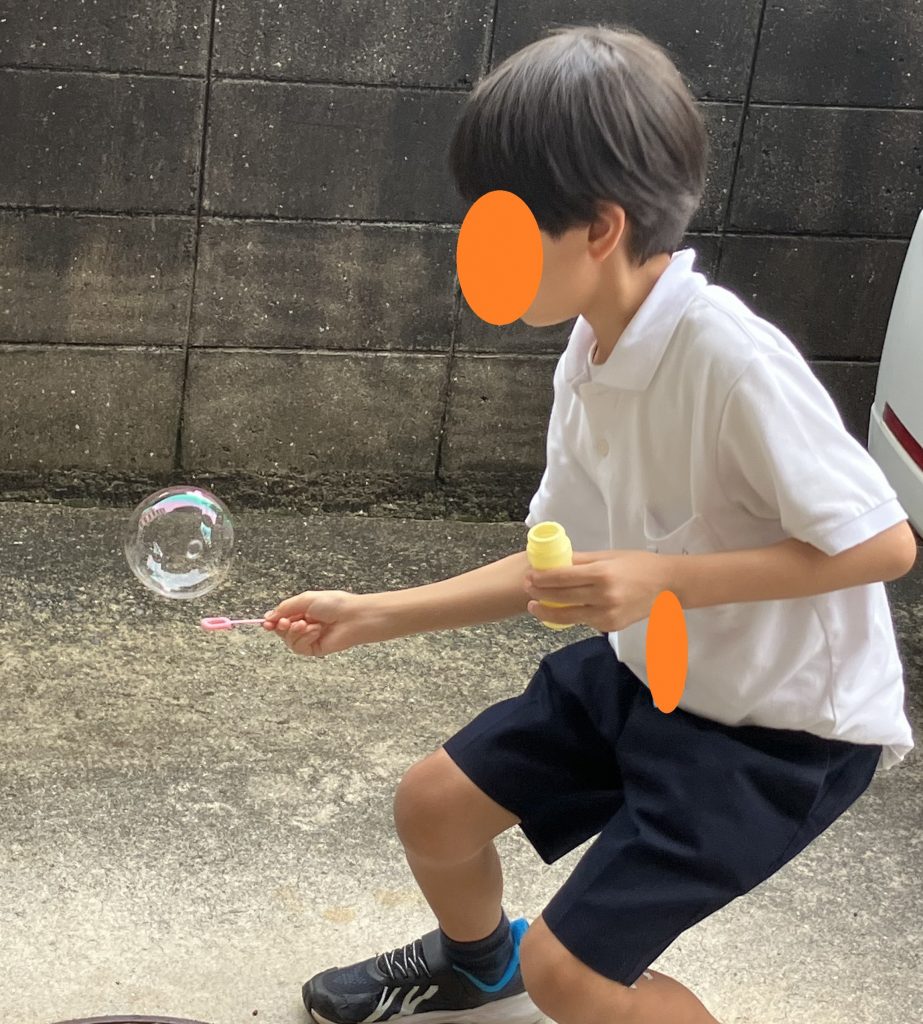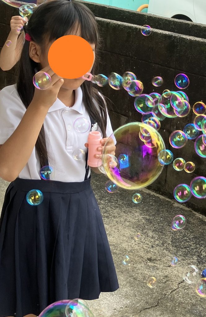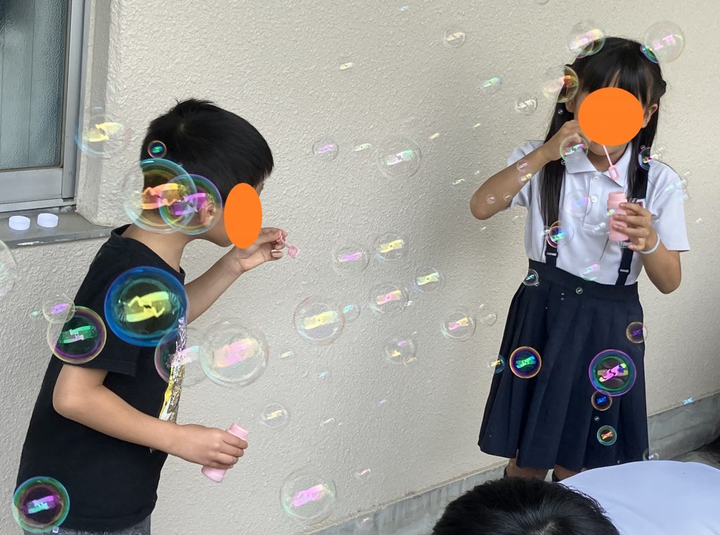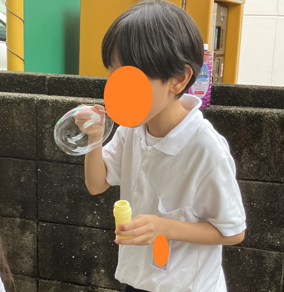 大きなシャボン玉を作ってそれを割らないように吹き具でそっとキャッチする遊び方や、湿った地面にシャボン玉をみんなで吹きかけて重ね、大きな島を作る遊び方など、それぞれの楽しみ方を見つけることが出来ました!