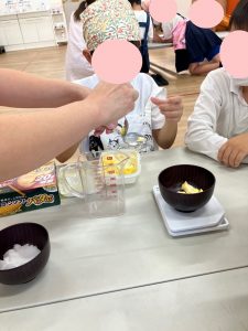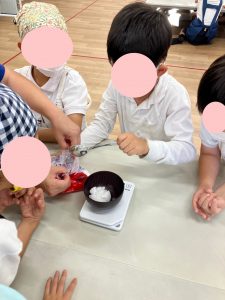 バターは、スプーンですくって計っていきます🥄「なかなか取れない。」「スプーンを2本使って、とる?」と言う意見もでました☺️