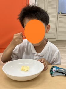 牛乳を入れる時には「ここまでいれてね」と言っていたり、混ぜるときには混ぜる係じゃない子が「こぼれないように持っとくね」と言って持ってあげたり、グループで協力して作っていく姿が見られました!