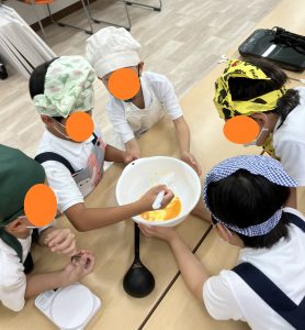 今回、小グループでのクッキングを行ってグループ内で話合って役割を決めることで協調性を育みます。
