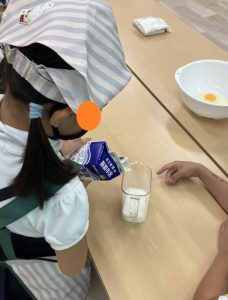 牛乳を入れる時には「ここまでいれてね」と言っていたり、混ぜるときには混ぜる係じゃない子が「こぼれないように持っとくね」と言って持ってあげたり、グループで協力して作っていく姿が見られました!
