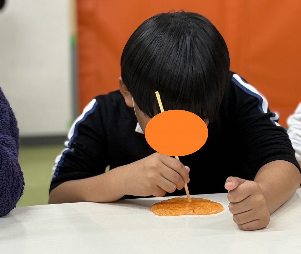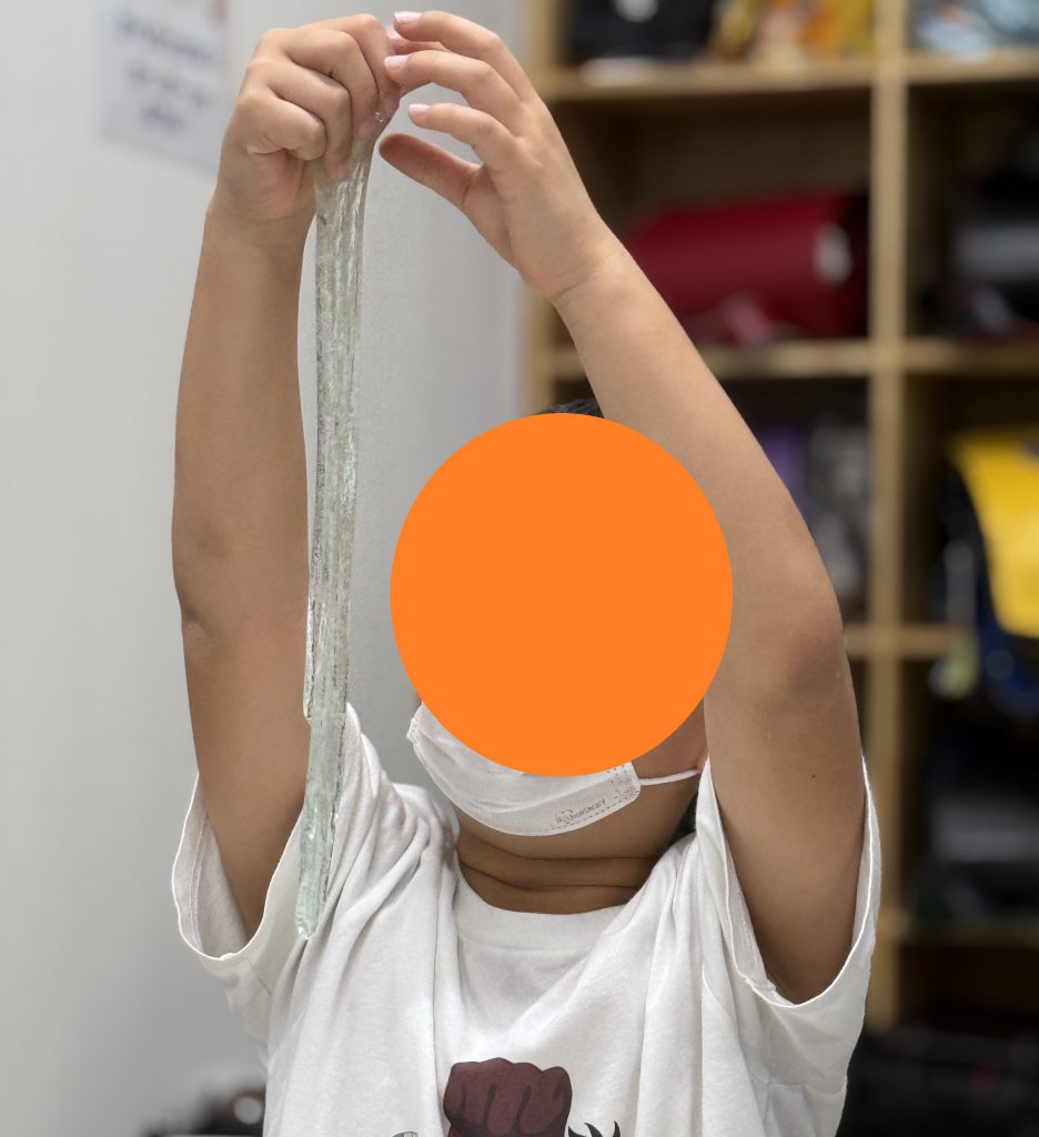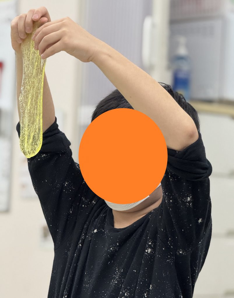 割り箸から机に垂れ下がる様子を眺める、割り箸を押し付けてメロンパンのような模様を作る、伸びたスライムを綿あめのようにぐるぐると巻きつける等々、様々な遊び方が見られました!