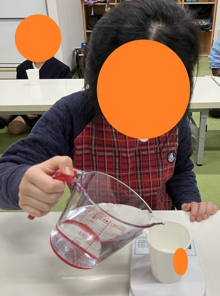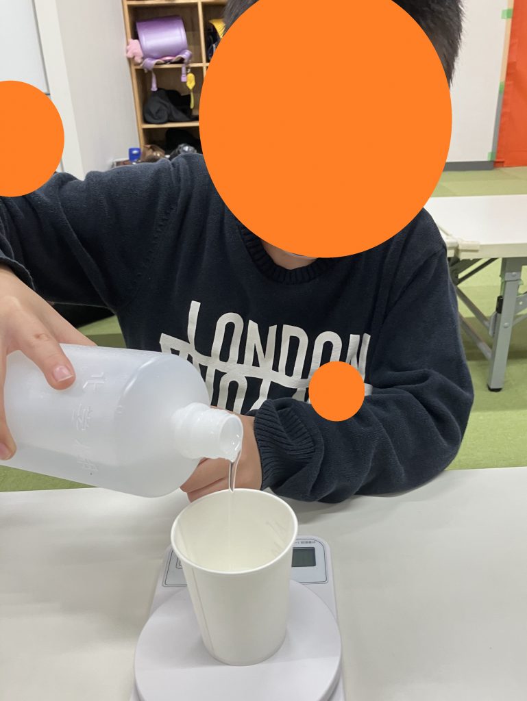 水、洗濯のりが25mlを超えないよう、量りの数字を見ながら力を微調整して紙コップに注ぎました。