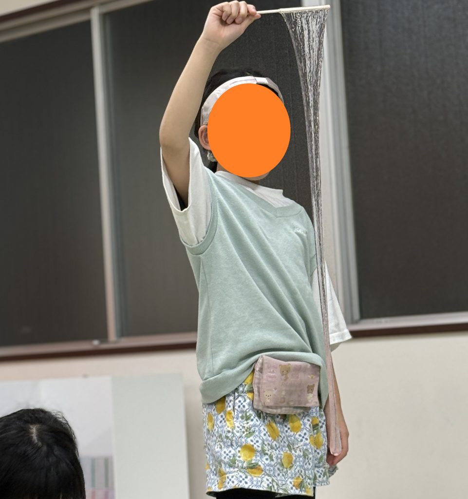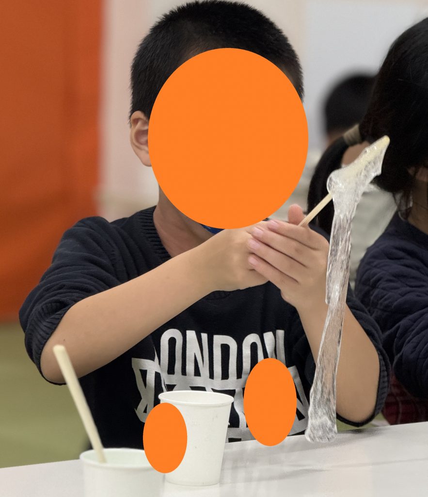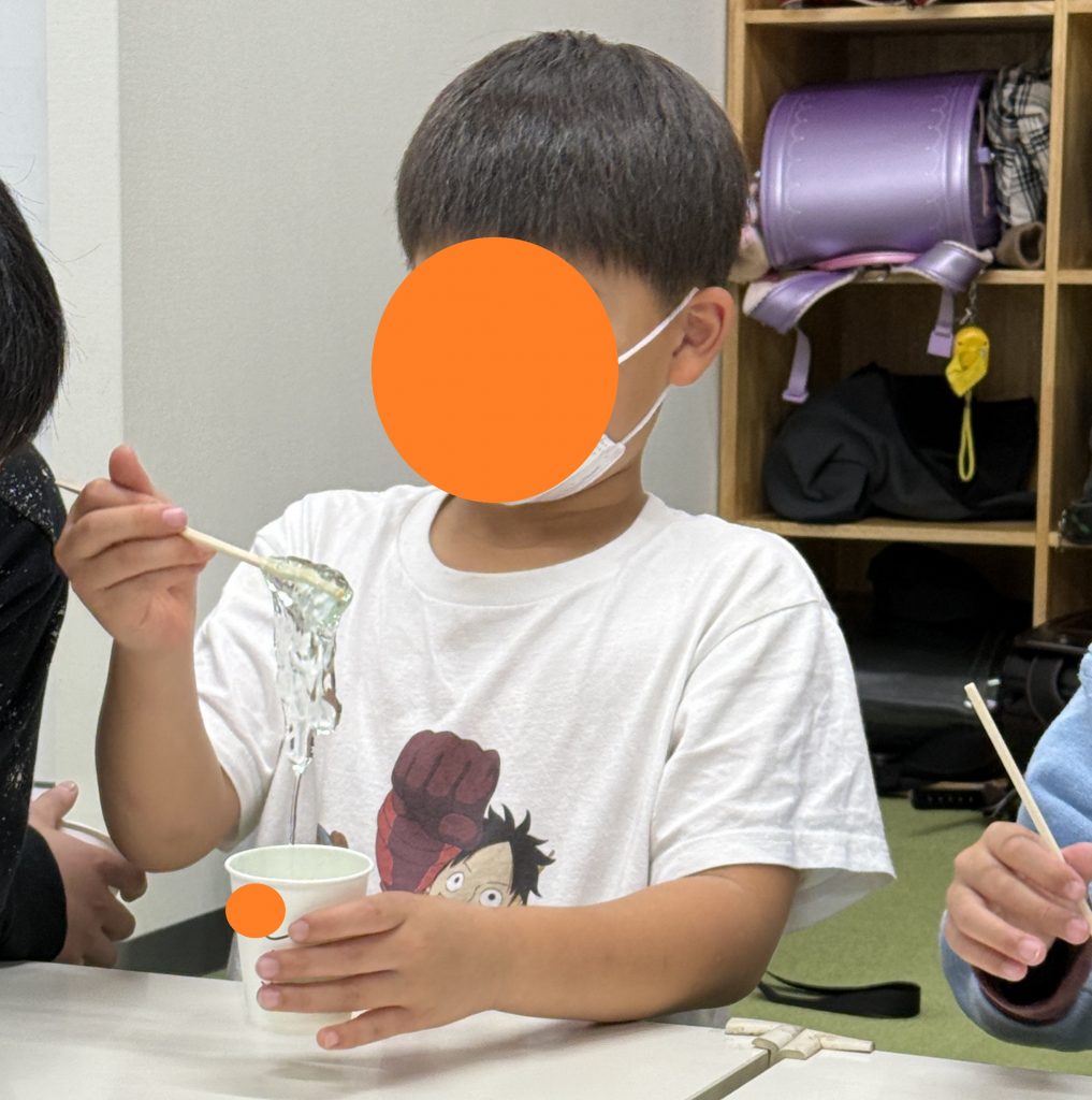 児童はスライムを混ぜながら、「まだサラサラ。」「ホウ砂水が足りないかも。」と、固まり具合を見てスタッフに伝えていました。割り箸にまとわりついて固まった部分と紙コップの底に水分が残った部分とで分かれていたり、伸びすぎて少し水っぽい状態だったりと、様々な変化を見て完成までの微調整を繰り返しました。