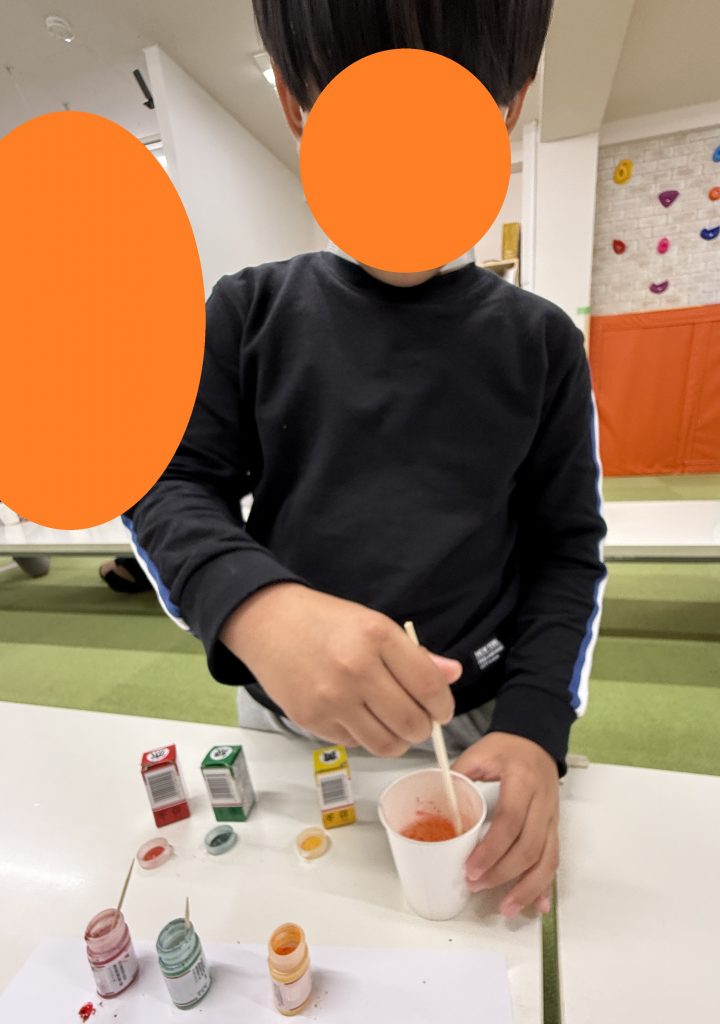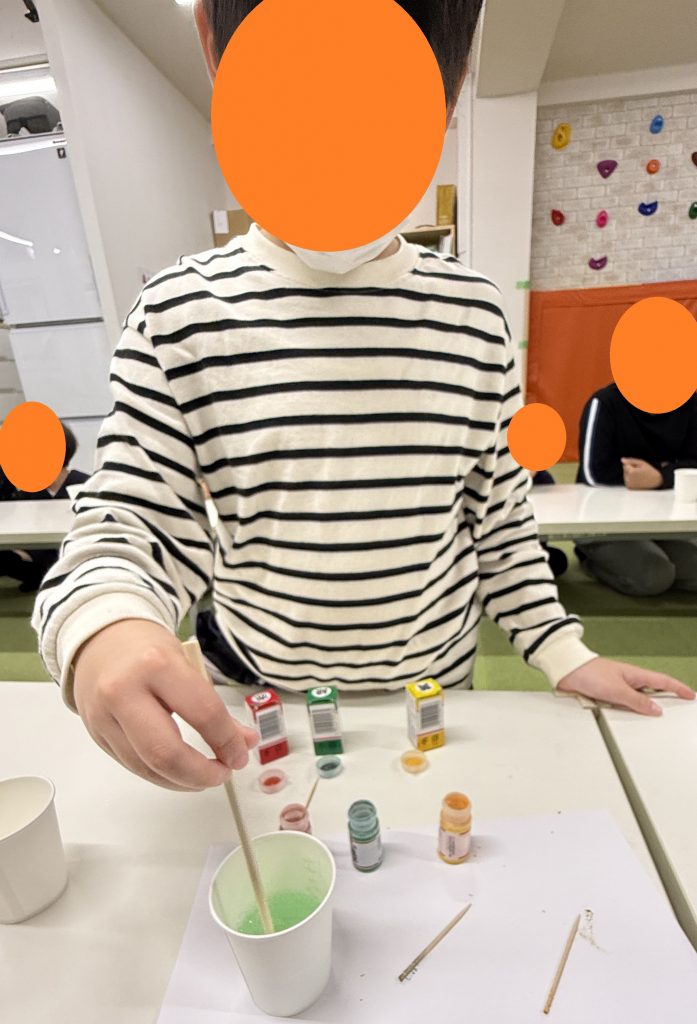 次に食紅を2色まで選んで加えました。食紅の色の組み合わせや量の割合を変えることでどのような色に変化するのか、思考力・想像力を働かせることが出来ます。