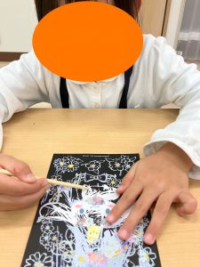 どんどん絵が出来上がり真っ黒の台紙から様々な色の線が出てくるので子どもたちは集中して楽しそうに笑顔で取り組めています!