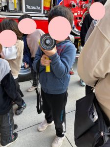 ホースの先の消防ノズルをひねると放水の種類を切り替えることが出来て、子どもたちは、水の勢いを体験することができてとても喜んでいました😄
