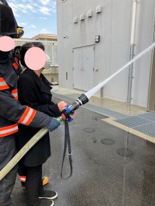 実際に、ホースの先につける消防ノズルを持たせてもらいました「これ思ったより重たい😅」