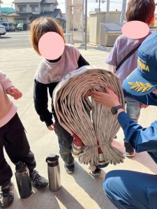長いホースは、ぐるぐるとまいてあり消防士さんが「何メートルあると思う?」という質問にしばらく考える子どもたち🤔🤔🤔