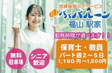 | 「放課後等デイサービスバババルーン福山駅家」では、保育士(正社員)を募集します。 | |