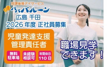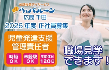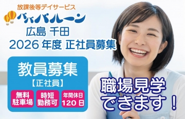 | 2026年度「放課後等デイサービスバババルーン広島千田」の教員(時短勤務OK)を募集します。 | |