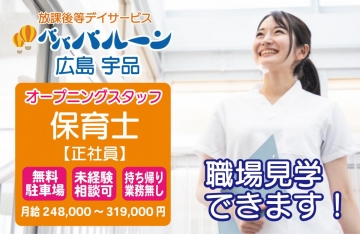 | 2026年4月オープン!「放課後等デイサービスバババルーン広島宇品」の保育士・幼稚園教諭(時短OK)を募集します。 | |